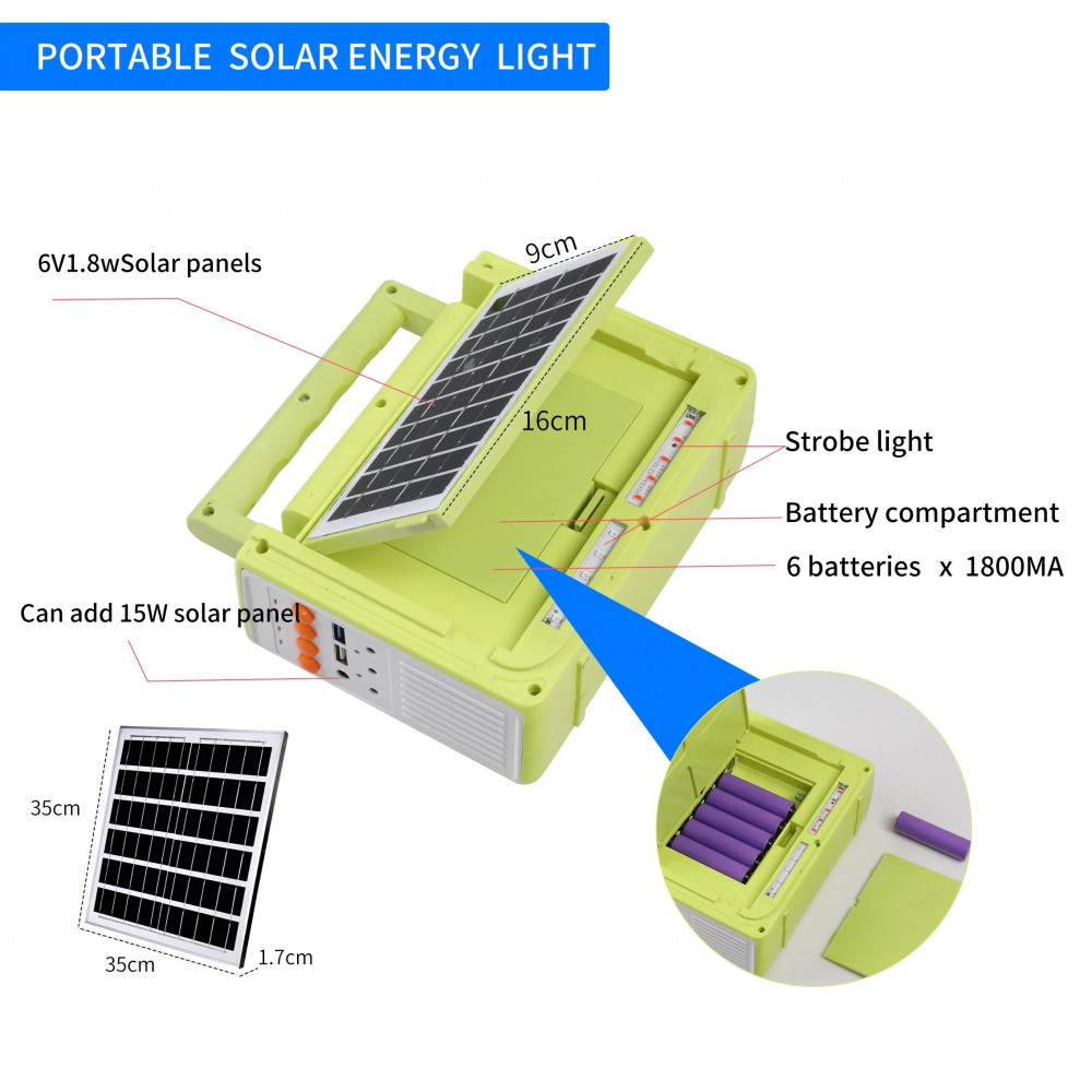 كشاف رحلات برية بقدرة 150 واط، يوفر إضاءة قوية ومتعددة الاتجاهات، يعمل بالطاقة الشمسية أو الشحن الكهربائي. مثالي للاستخدام في الرحلات البرية والتخييم والمناطق الخارجية البعيدة عن مصادر الكهرباء التقليدية. يتميز بتصميم متين ومحمول، مع إضاءة موجهة في الأمام، وإضاءة جانبية، وإضاءة سيفتي خلفية للحماية من الحيوانات. يحتوي على مخرج USB ومخارج لمبات، مع إمكانية التحكم بلوح الطاقة الشمسية.